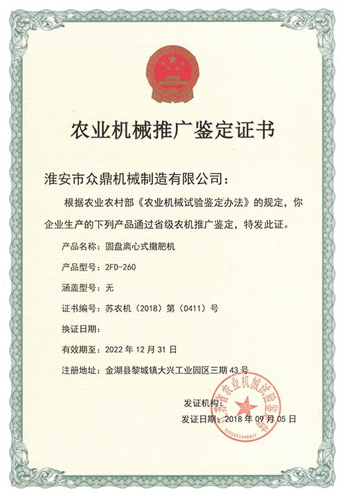 農(nóng)業(yè)機(jī)械推廣鑒定證書(shū)2FD-260